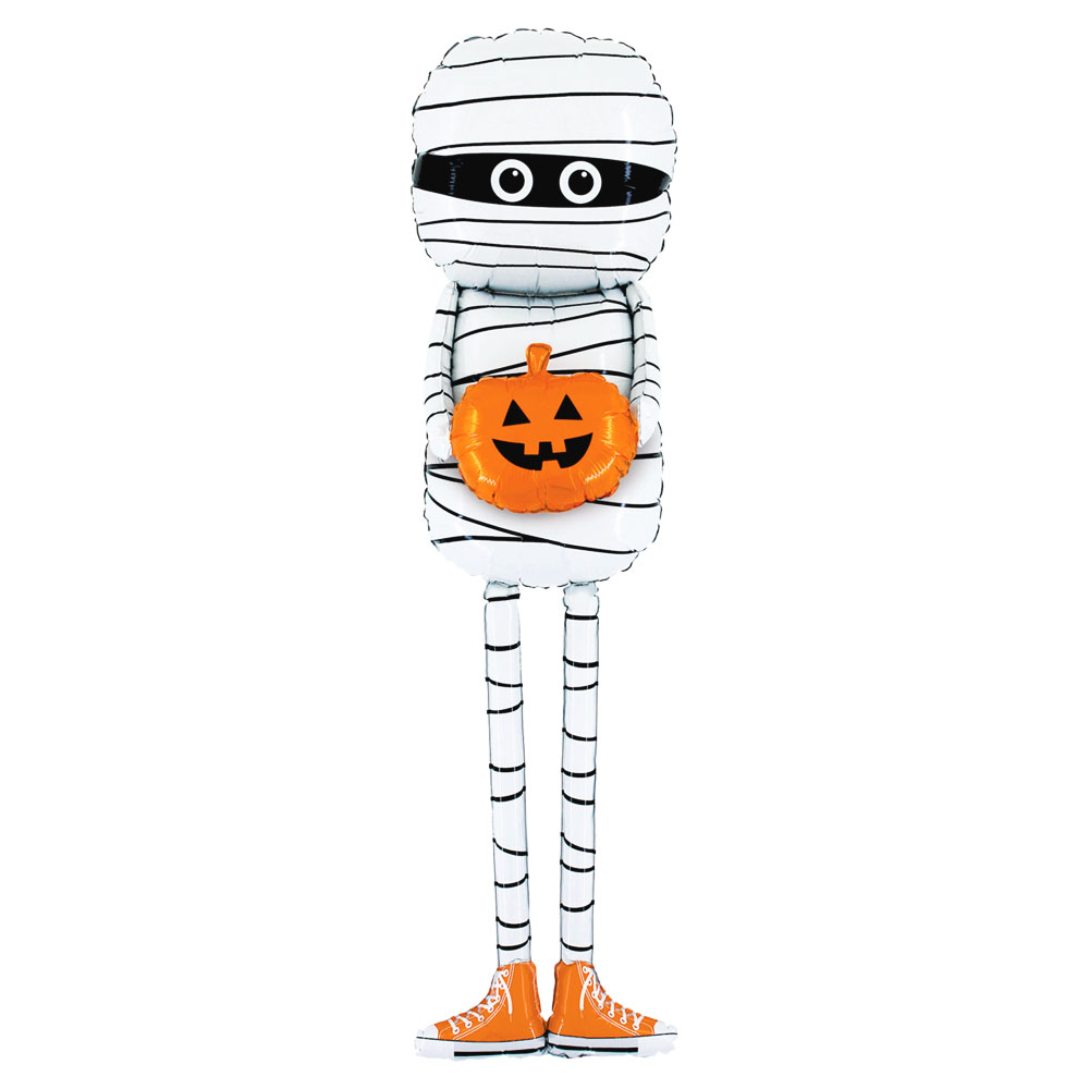Wow, en jättelång, superfräck och lagom läskig mumie ballong med pumpa och coola skor! Denna häftiga och lite söta folieballong mumie blir ett kul pynt och cool party dekoration som passar alla som ska ha Halloween fest och kalas.