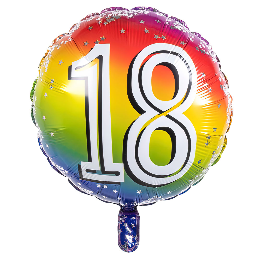 Folieballong Regnbåge 18 år omfattar en folieballong med regnbågsbakgrund och siffran 18 på.