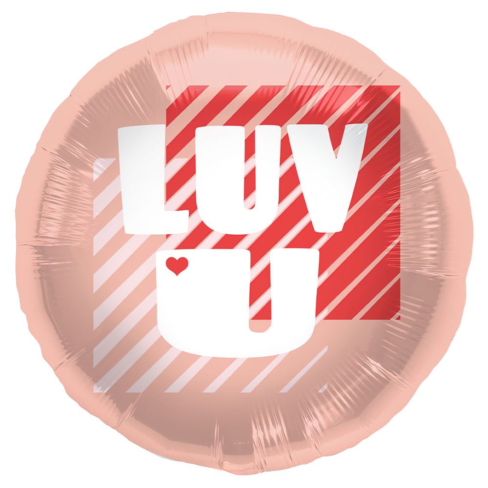 Folieballong Rund Luv U omfattar en ljusrosa rund folieballong med texten "Luv U" i vitt med ett litet rött hjärta samt röda och rosa detaljer. Ballongen rymmer ca 18 liter och fylls med helium eller luft och har självförslutande ventil.