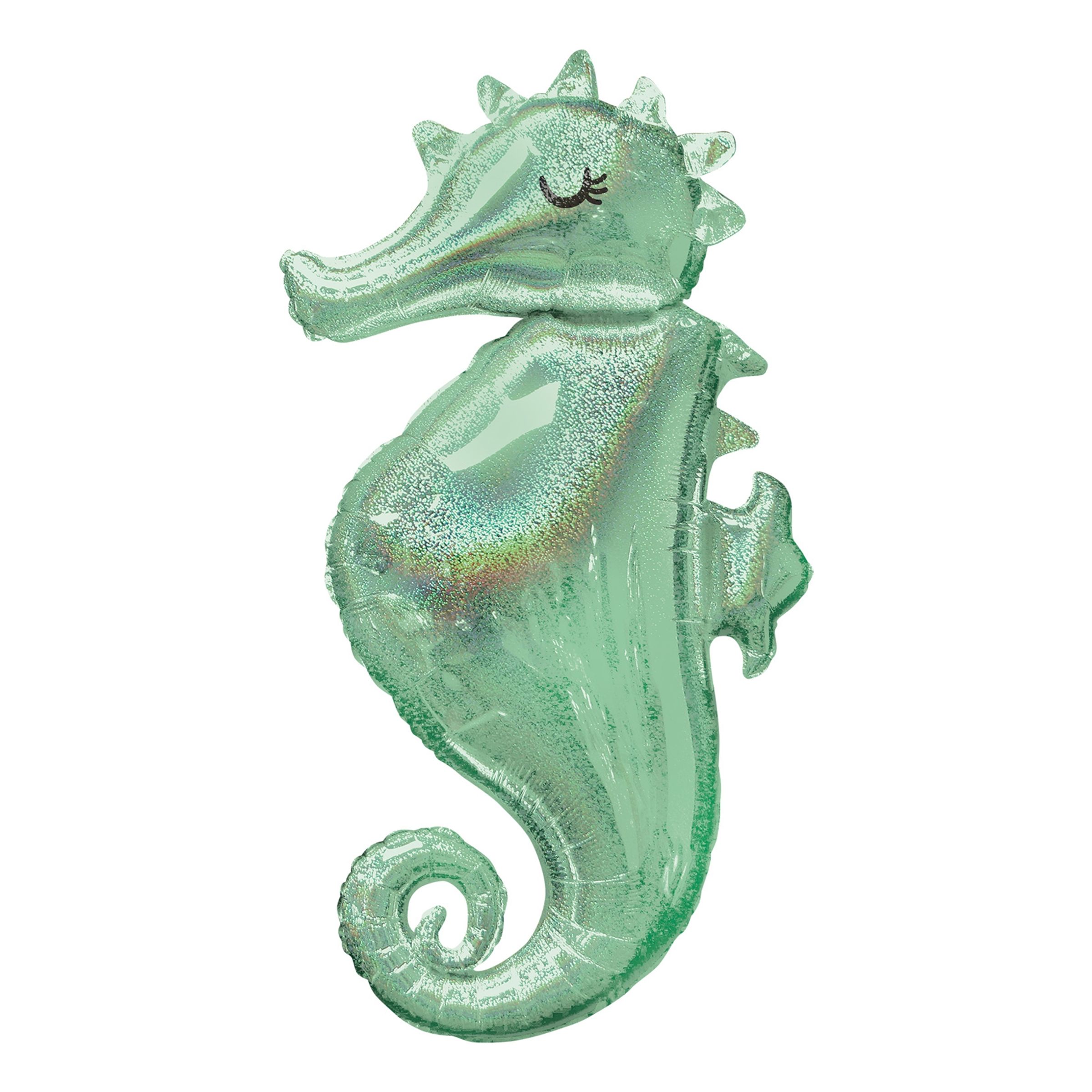 Vad vore ett kalas med havstema utan en sjöhäst eller två? Fyll upp den här underbara folieballongen med helium och låt den simma runt i luften som att festlokalen var på havets djupa botten!