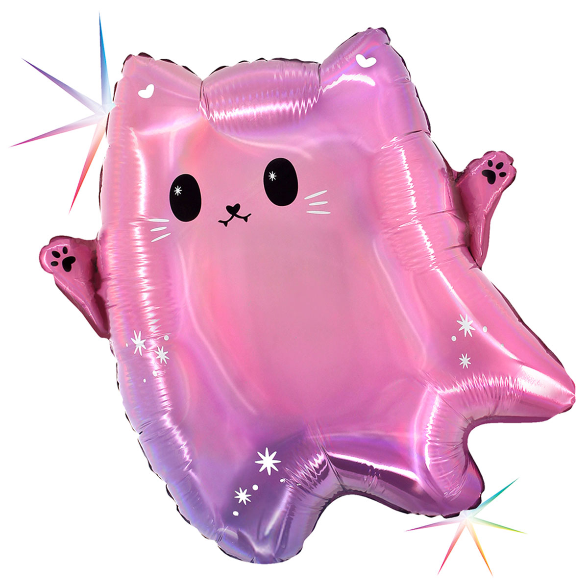 Folieballong Söt Spökkatt Holografisk omfattar en holografisk folieballong i form av en bedårande spökkatt i en fantastisk reflexrosa färg.