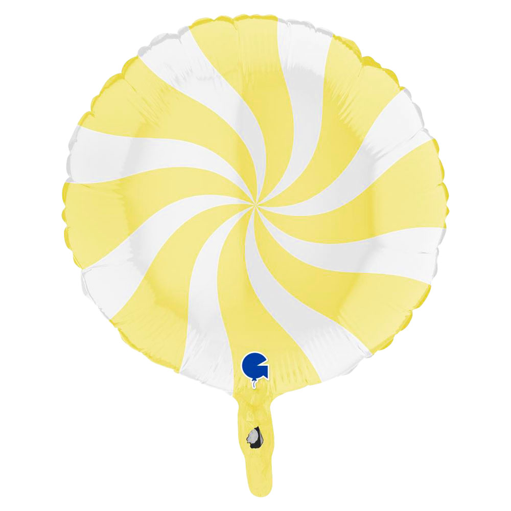 Folieballong Swirly Ljusgul & Vit innehåller en rund matt folieballong med virvel-mönster i pastell gult och vitt.