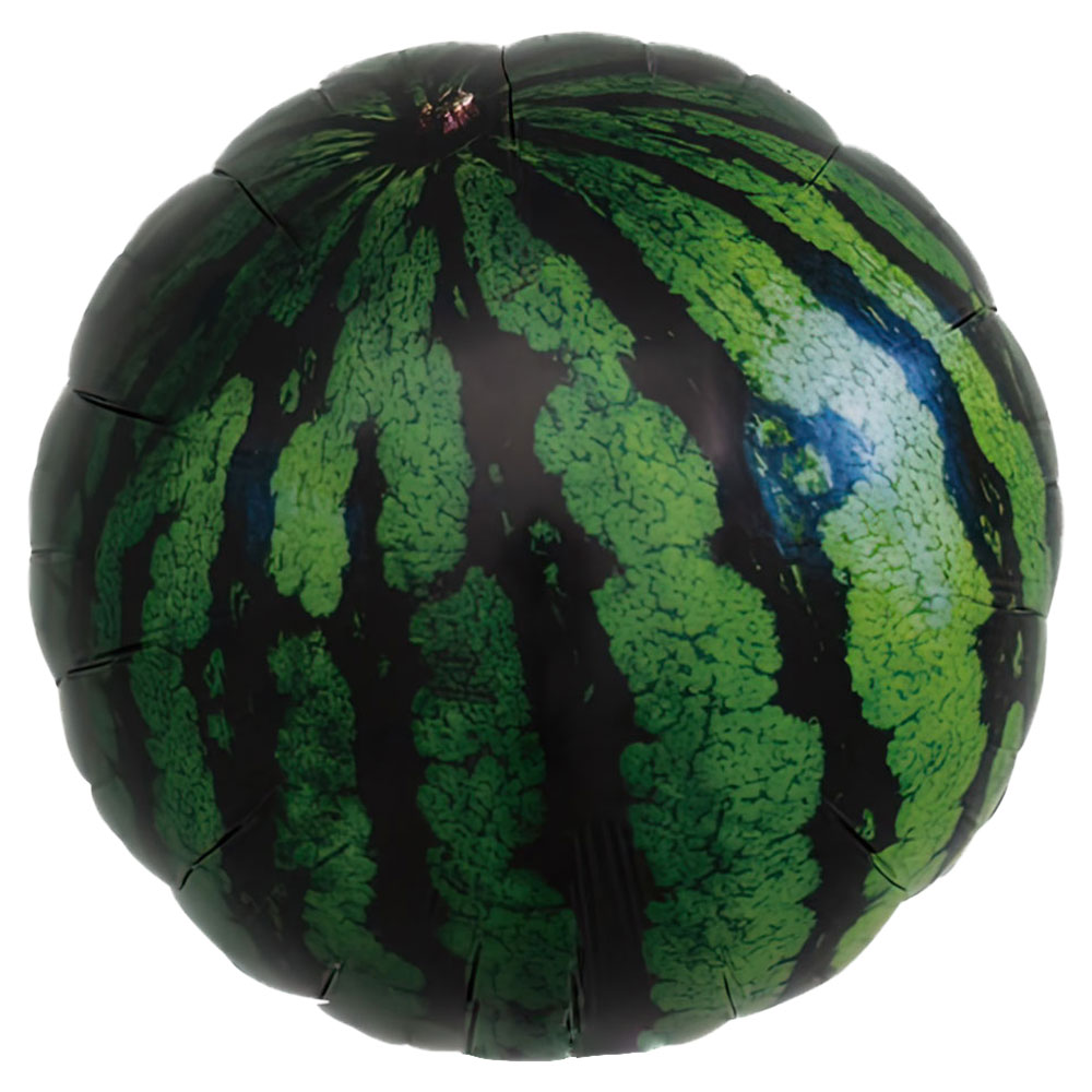 Folieballong Vattenmelon omfattar en rund folieballonger med motiv av vattenmeloner. Ballongen fylls med luft eller helium och mäter ca 35 cm i diameter. Medföljer även vitt ballongsnöre.