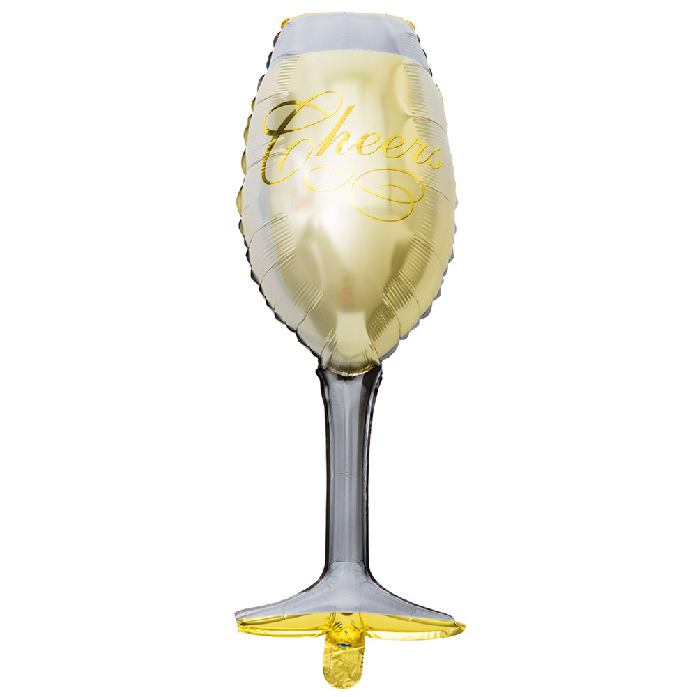 Folieballong Vinglas Cheers innehåller en folieballong som föreställer ett fullt vinglas med vad som ser ut som vitt vin. På glaset står det Cheers i snirkliga guldbokstäver. Kan fyllas med helium, alternativt luft.