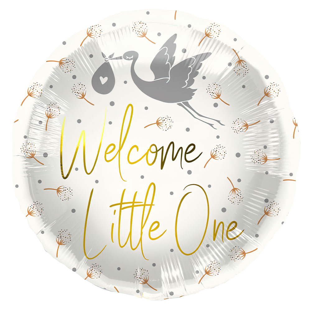 Folieballong Welcome Little One omfattar en rund och glansig vit folieballong med motiv av en flygande stork med ett bebisknyte i munnen med prickar och blommor runtom i grått och orange med texten "Welcome Little One" i smal guldtext. Ballongen är ca 45 cm stor och fylls med luft eller helium och rymmer ca 18 liter.