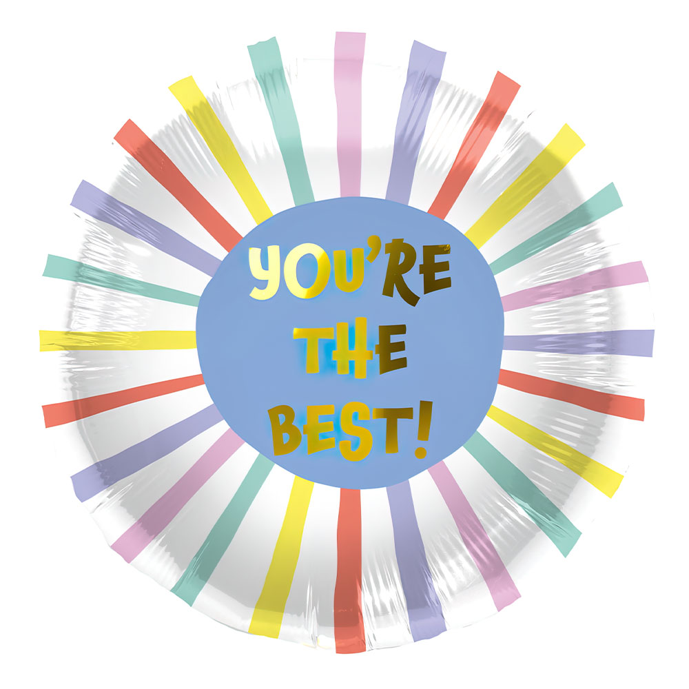 Folieballong You´re The Best omfattar en folieballong i vitt med rund form och färgglada streck i olika färger med texten "You´re the best!" i guld på lilablå bakgrund. Ballongen rymmer ca 18 liter och fylls med helium eller luft och är ca 45 cm stor.