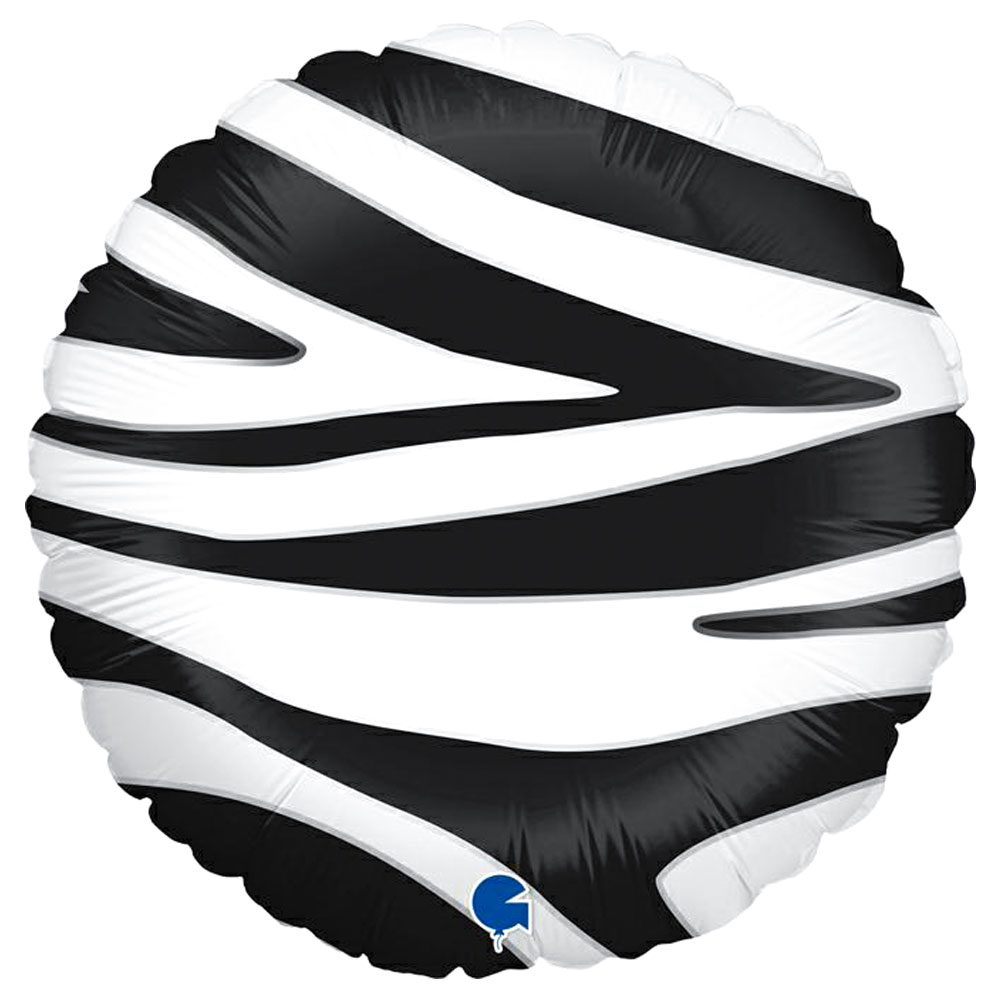 Folieballong Zebramönster omfattar en rund folieballong med zebramönster i svart och vitt. Ballongen fylls med luft eller helium och mäter ca 46 cm i diameter uppblåst. Ballongen svävar i upp till en vecka med helium.