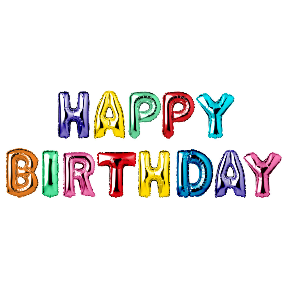 Folieballonger Happy Birthday Färg Mix omfattar 13 stycken folieballonger i form av färgglada bokstäver i texten "Happy Birthday". Ballongerna fylls med luft med hjälp av medföljande sugrör och fästs med vitt snöre.