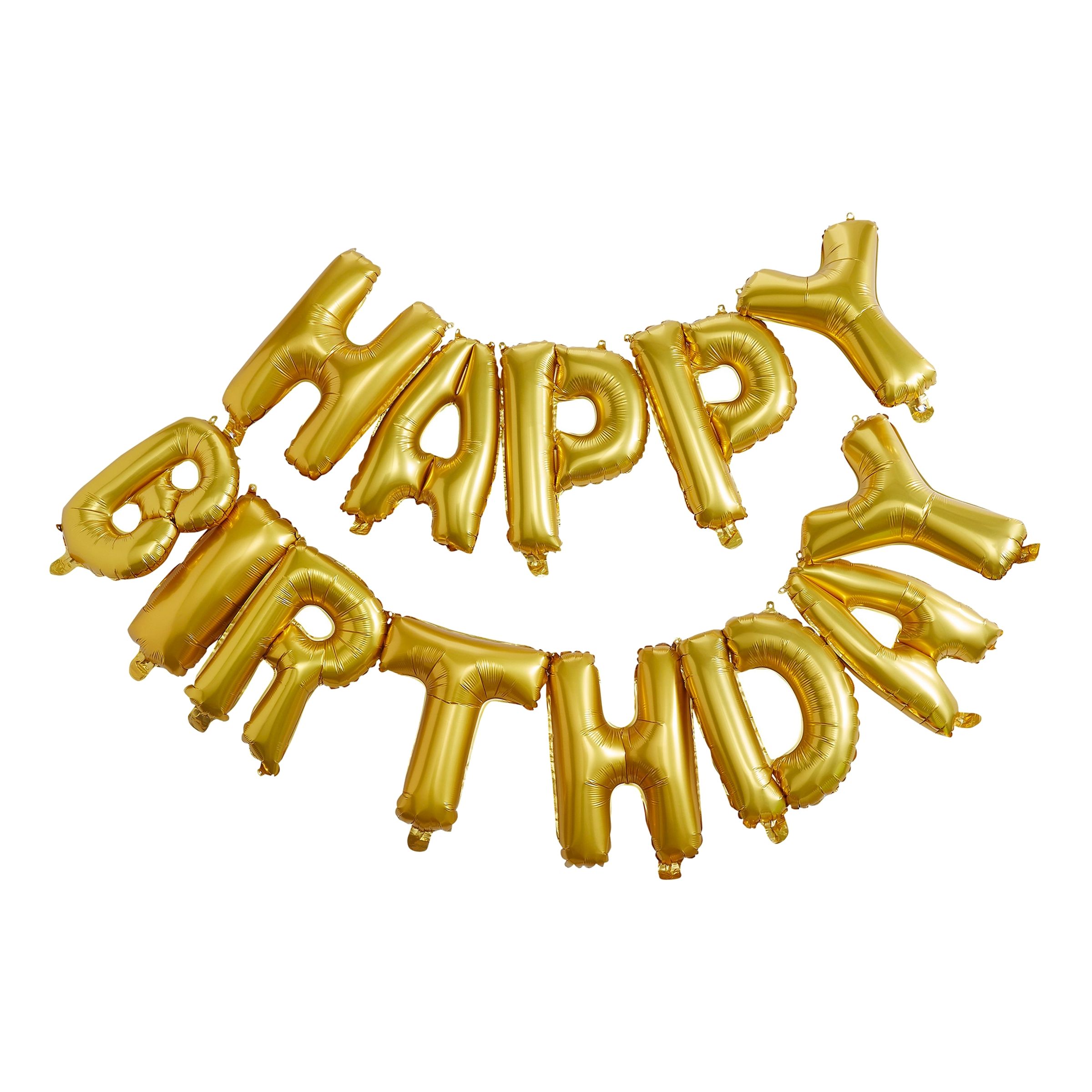 Folieballonger Happy Birthday Guld får du 13 folieballonger i färgen guld som tillsammans bildar meningen '' Happy Birthday ''. Du får även med ett genomskinligt snöre som du kan knyta fast ballongerna på så dom håller sig på plats!