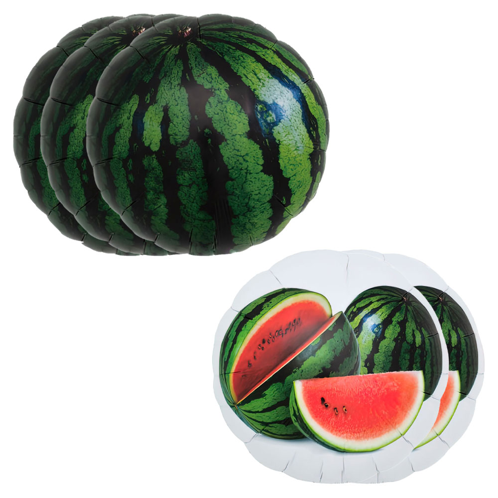 Folieballonger Vattenmelon 5-pack omfattar fem stycken runda folieballonger med motiv av vattenmeloner. Ballongerna fylls med luft eller helium och mäter ca 35 cm i diameter.