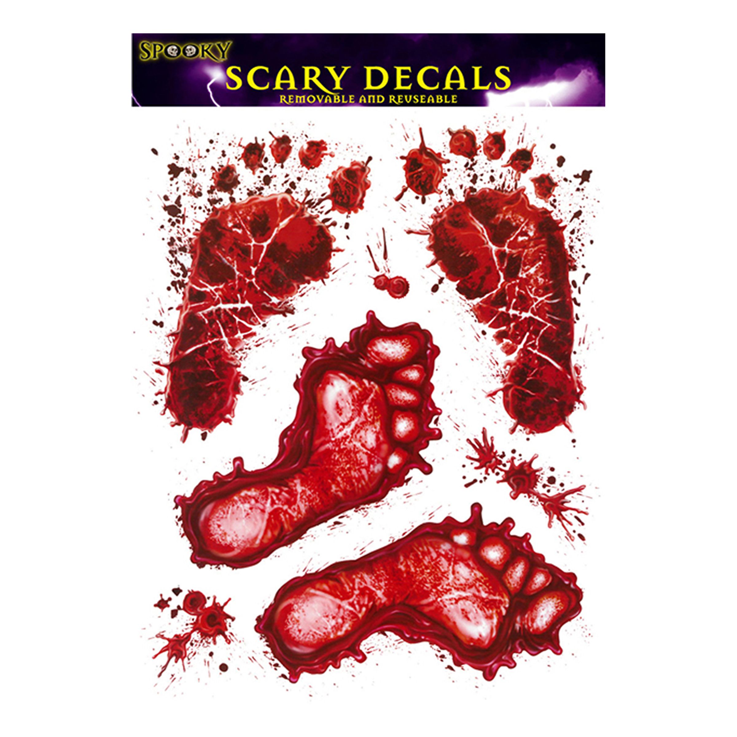Fönsterdekaler Halloween Fötter är en plastfilm med motiv av röda blodspår av fötter. Perfekt att dekorera badrumsgolvet eller köksfönstret med! Levereras med ett ark med 7 dekaler varav 4 fötter.