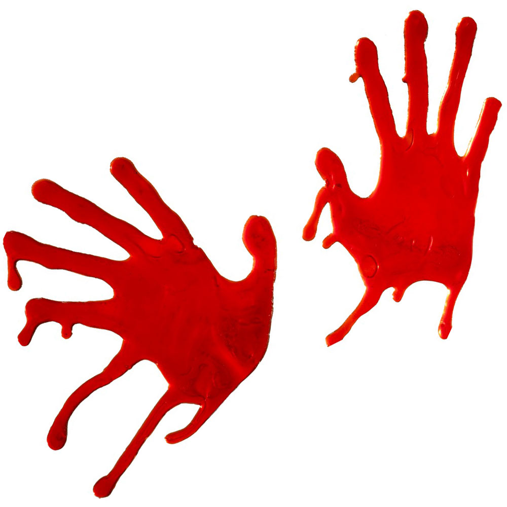 Fönsterdekoration Blodiga Handavtryck omfattar ett par röda fönsterdekorationer i form av handavtryck med en rinnande-effekt liknande blod.