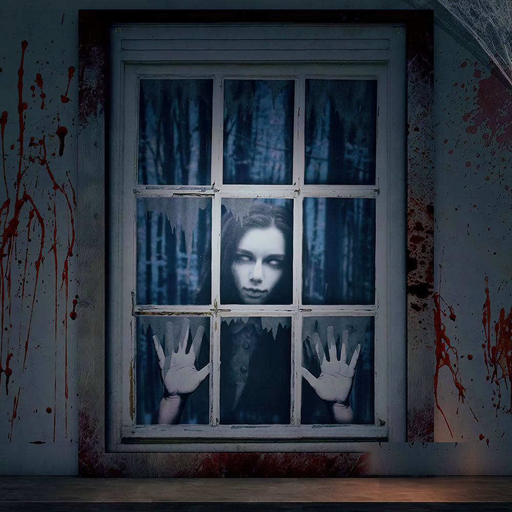Skräm alla dina grannar med denna spöklika fönsterdekoration och se om någon vågar komma och knacka på! Denna fönsterdekoration kommer få det att se ut som om en kuslig kvinna tittar ut genom ditt fönster, vilket blir en perfekt halloween-dekoration för dig som vill sätta skräck i alla som råkar gå förbi ditt hus. Effektfull fönsterdekoration som höjer kusligheten till max!