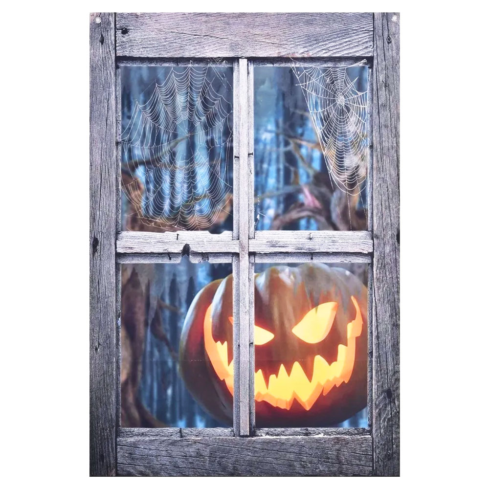 Fönsterdekoration Halloween Pumpa omfattar ett tygstycke att sätta på insidan av fönstret med motiv av en pumpa med läskigt ansikte i ett gammalt fönster med spindelnät. Dekorationen är tillverkad i polyester och är ca 120 lång och 80 cm bred.