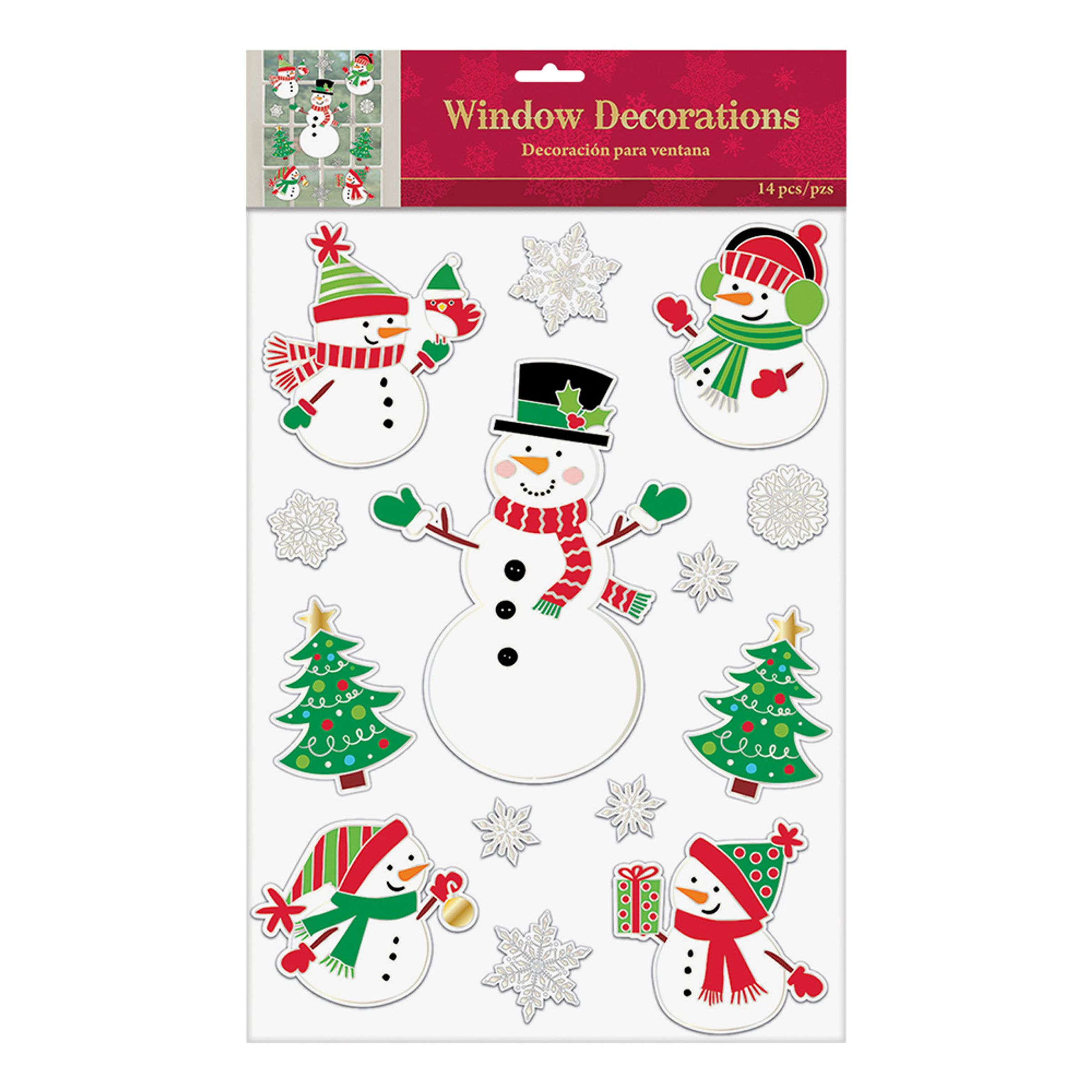 Fönsterdekorationer Snögubbe är ett ark som inkluderar totalt fjorton stycken klistermärken med härliga motiv av snögubbar, julgranar och snöflingor. Klistermärkena är gjorda för att fästa på ett fönster som en kul juldekoration.