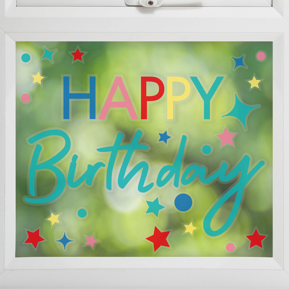 Dekorera ditt fönster till födelsedagen med dessa fina happy birthday klistermärken! Färgglada fönsterstickers i form av texten "Happy Birthday", stjärnor, cirklar och diamanter som blir en utmärkt födelsedags-dekoration för dig som vill dekorera riktigt ordentligt inför kommande födelsedag. Fäst dem snyggt på fönstret och få genast till ett riktigt stämningshöjande pynt!