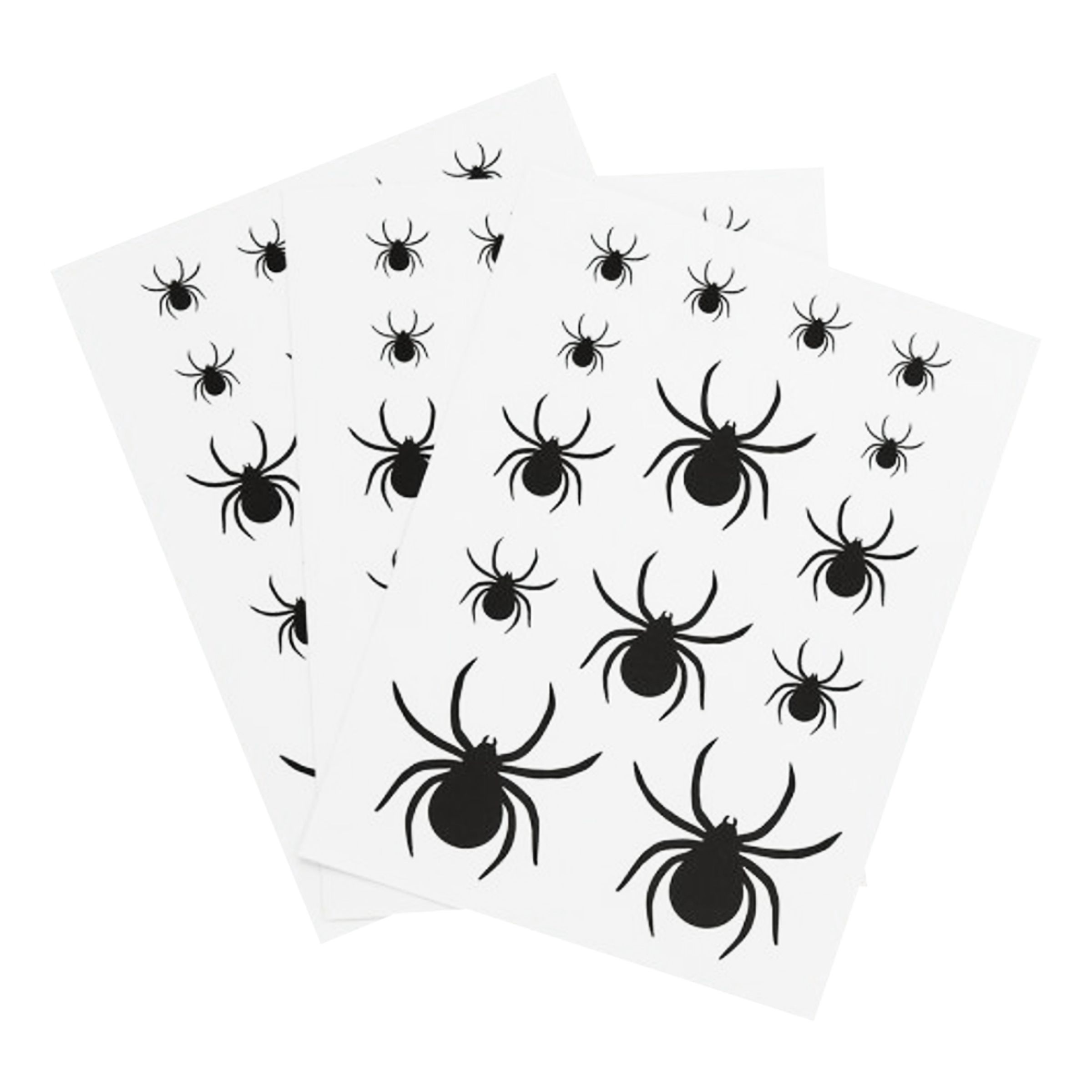 Fönsterstickers Spindlar inkluderar tre ark fyllda med spindlar i fyra olika storlekar. Fäst dem på fönstren, en vas eller golvet.