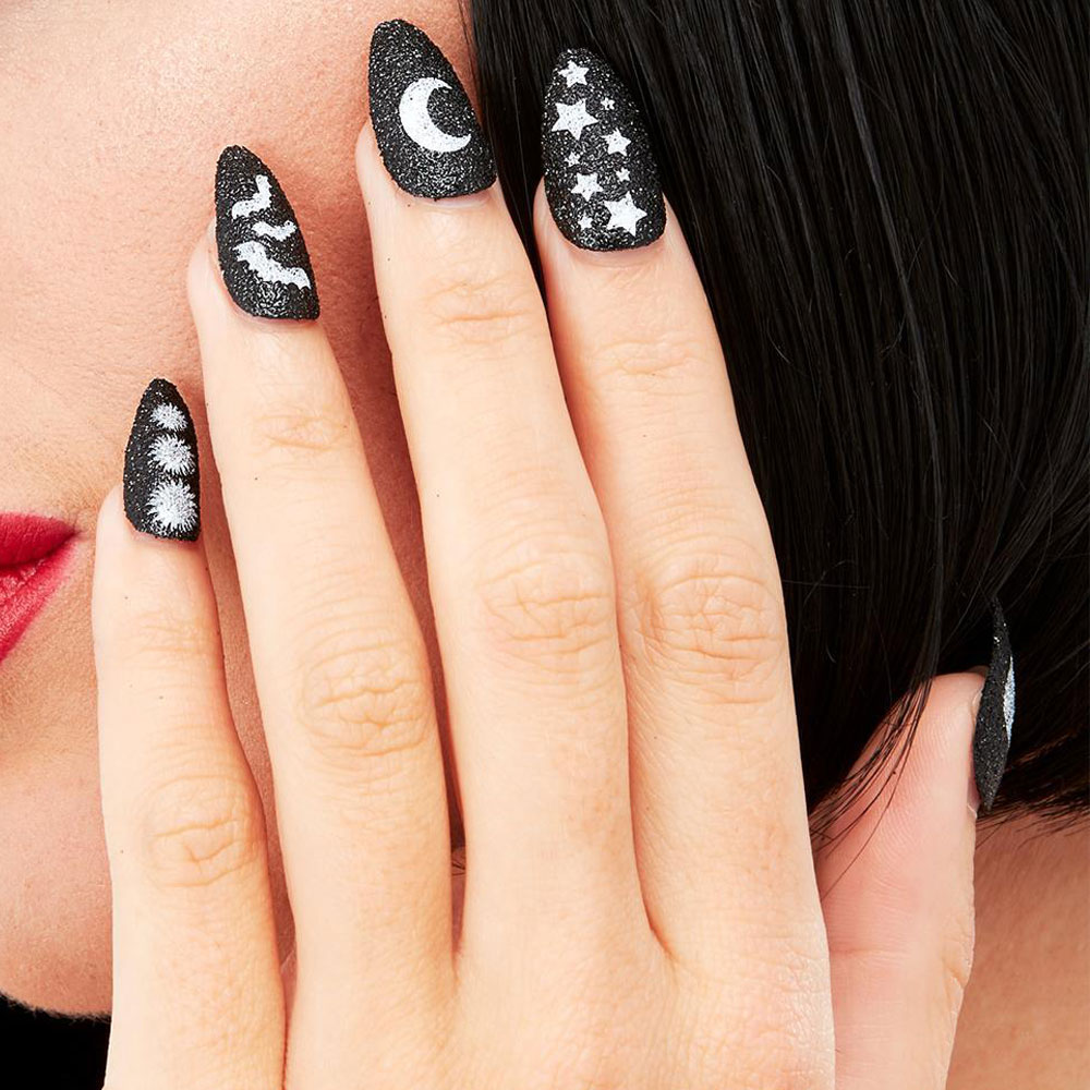 Förhäxande Lösnaglar består av ett paket med 12 stycken självhäftande lösnaglar i svart med olika små vita motiv av månar, stjärnor, solar och fladdermöss. Fäst lösnaglarna genom att försiktigt trycka fast dem på dina egna naglar. Lösnaglarna kan tas bort med varmt vatten.