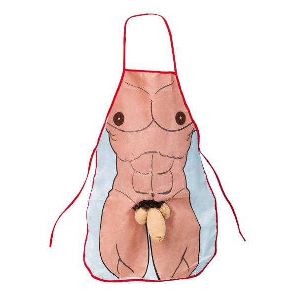 Förkläde för Män är designat med ett humoristiskt tryck av en naken, muskulös manskropp komplett med markerade magrutor, bröstvårtor – och ett vadderat, tredimensionellt könsorgan med tillhörande “pubishår” mitt på.