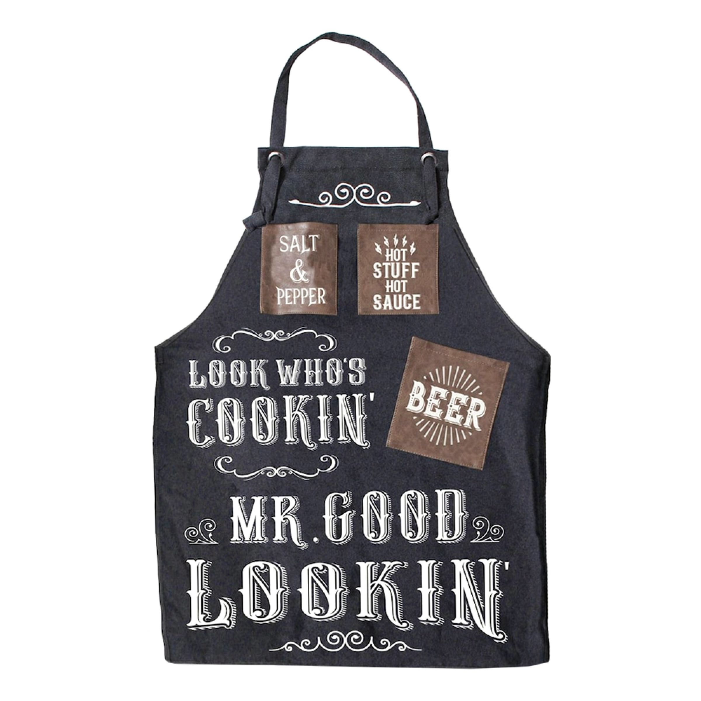 Förkläde Mr Good Lookin kommer med texten “Look Who’s Cookin’, Mr Good Lookin’” på ett slitstarkt och tjockt canvasmaterial. Förklädet kommer dessutom med justerbara remmar, så det passar både innan och efter maten! Perfekt som ett roligt grill-förkläde under sommaren, eller som en snygg köksaccessoar året runt!