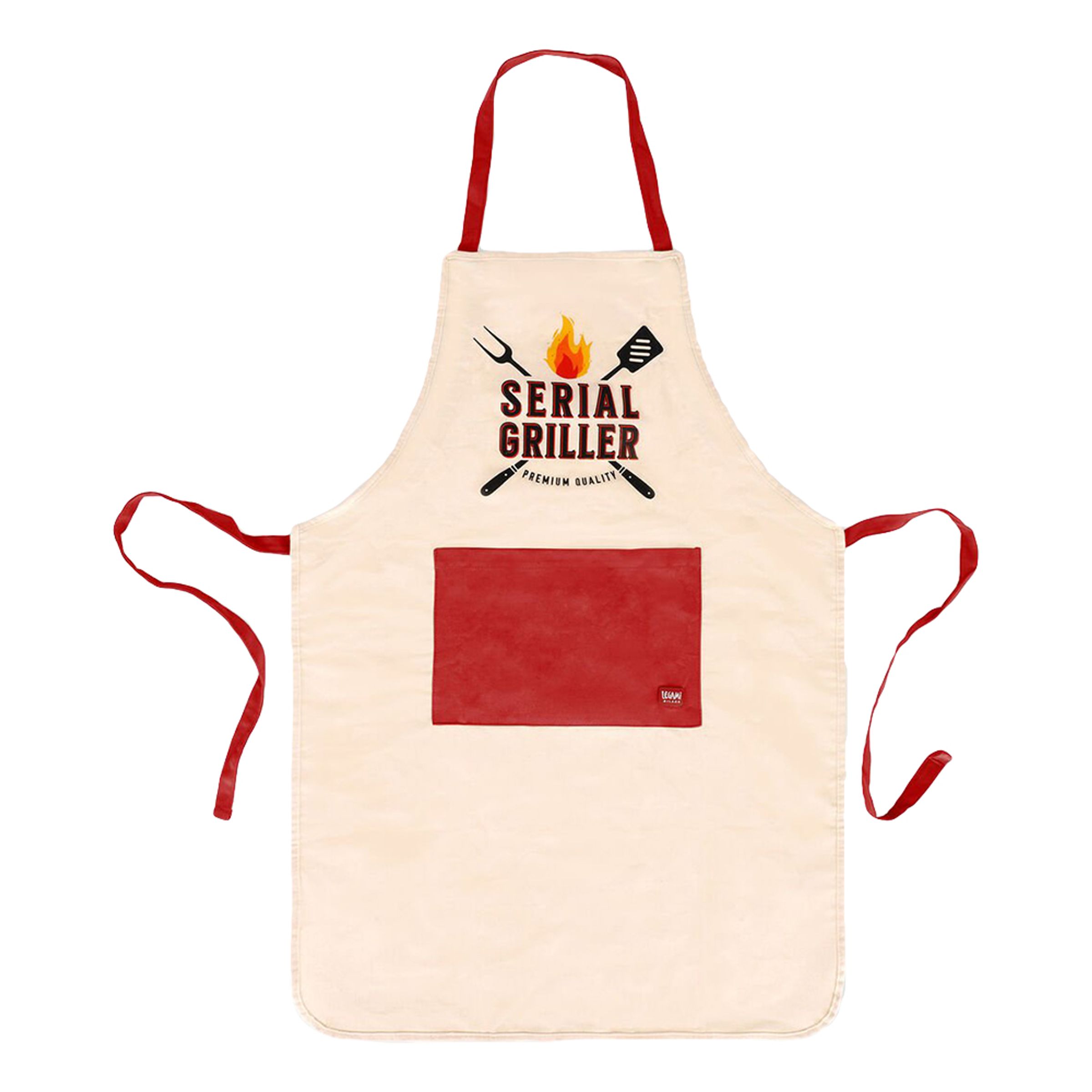 Förkläde Serial Griller är en vitt förkläde med stor frontficka som kommer med röda detaljer och texten "Serial Griller". Perfekt att ge bort som present till en äkta livsnjutare som älskar en bra grillkväll!