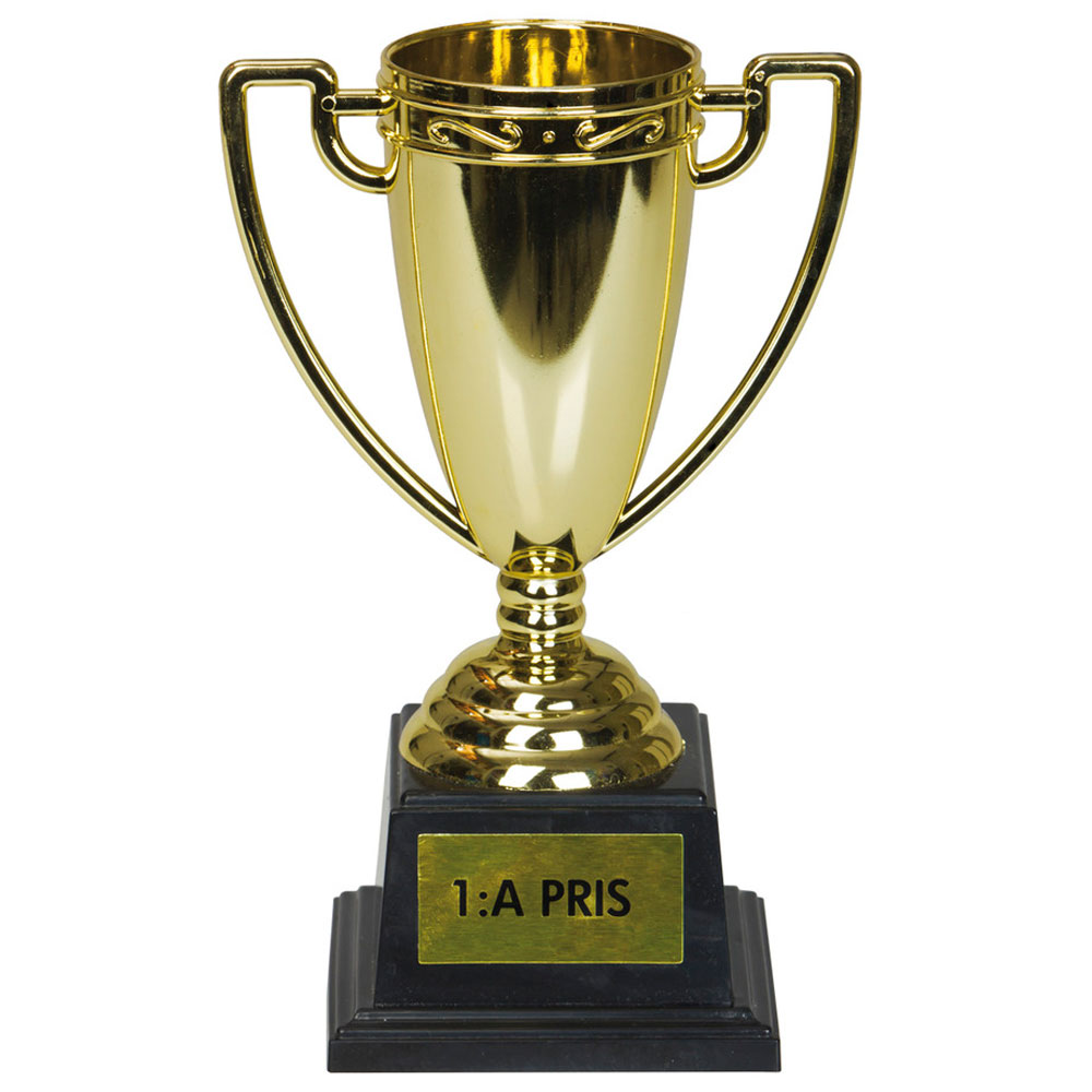 Första Pris Pokal innefattar en guldpokal som är gjord i hårdplast med texten "första pris" på.