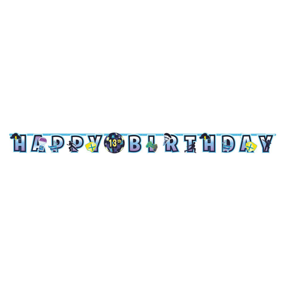 Fortnite Battle Royal Girlang Happy Birthday omfattar en lång bokstavsgirlang som stavar ut Happy Birthday med gaming motiv på bokstäverna. I mitten har den en discokula för att anpassa girlangen till åldern. Två var av siffrorna 0-9 plus ordinal suffixen "st, nd, rd, th", samt fästkuddar att fästa på girlangen.