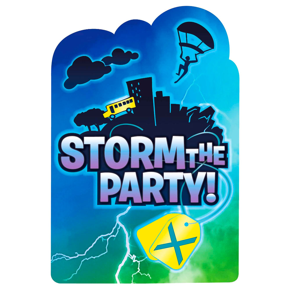 Fortnite Battle Royal Inbjudningskort omfattar 8 stycken inbjudningskort med texten "Storm the Party!" på framsidan och festinformation på baksidan, inklusive namn, tid, datum, adress och O.S.A. Innehåller även kuvert samt klistermärken för att försegla breven.