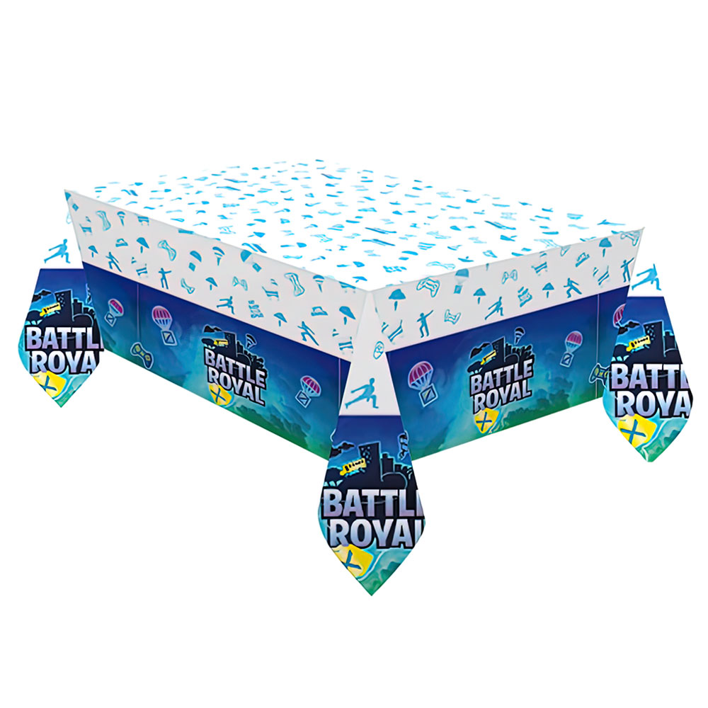 Fortnite Battle Royal Pappduk omfattar en pappduk med Fortnite motiv, duken är vit med ljusblå illustrationer och en färgad kant med texten "Battle Royal" och spel-motiv.