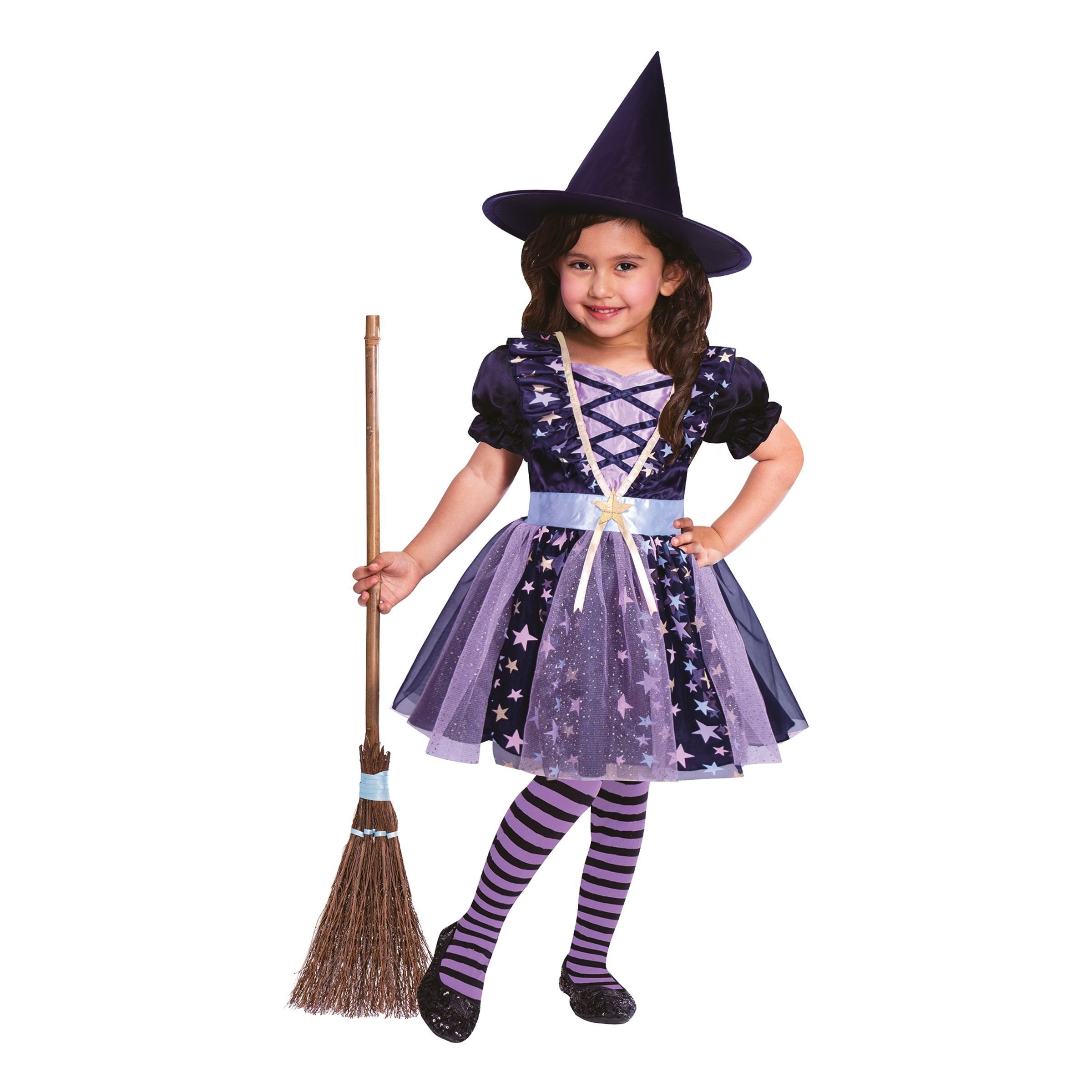 Förtrollad Häxa Barn Maskeraddräkt inkluderar en söt klänning i mörklila färg med fina mönster av stjärnor och glittrande spetsdetaljer. Medföljer gör en matchande häxhatt i klassisk, spetsig design. Matcha med strumpbyxor och häxkvast för att få den look som på bilden.