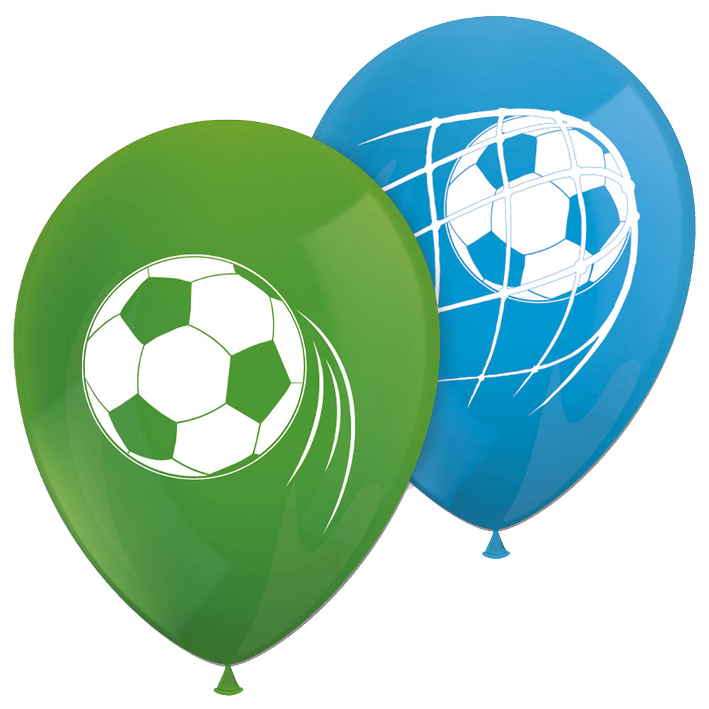 Fotboll Ballonger Soccer Fans omfattar 8 st gröna och blåa latexballonger med vita fotbollsmotiv. Ballongerna är 28 cm stora och fylls med luft eller helium.