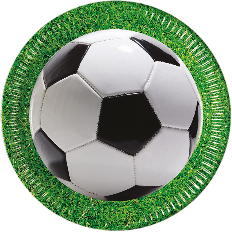 Fotboll Tallrikar kommer i pappmaterial med motiv av fotbollsgräs vid ytterdelen, och en klassisk svart- och vitfärgad fotboll i mitten.