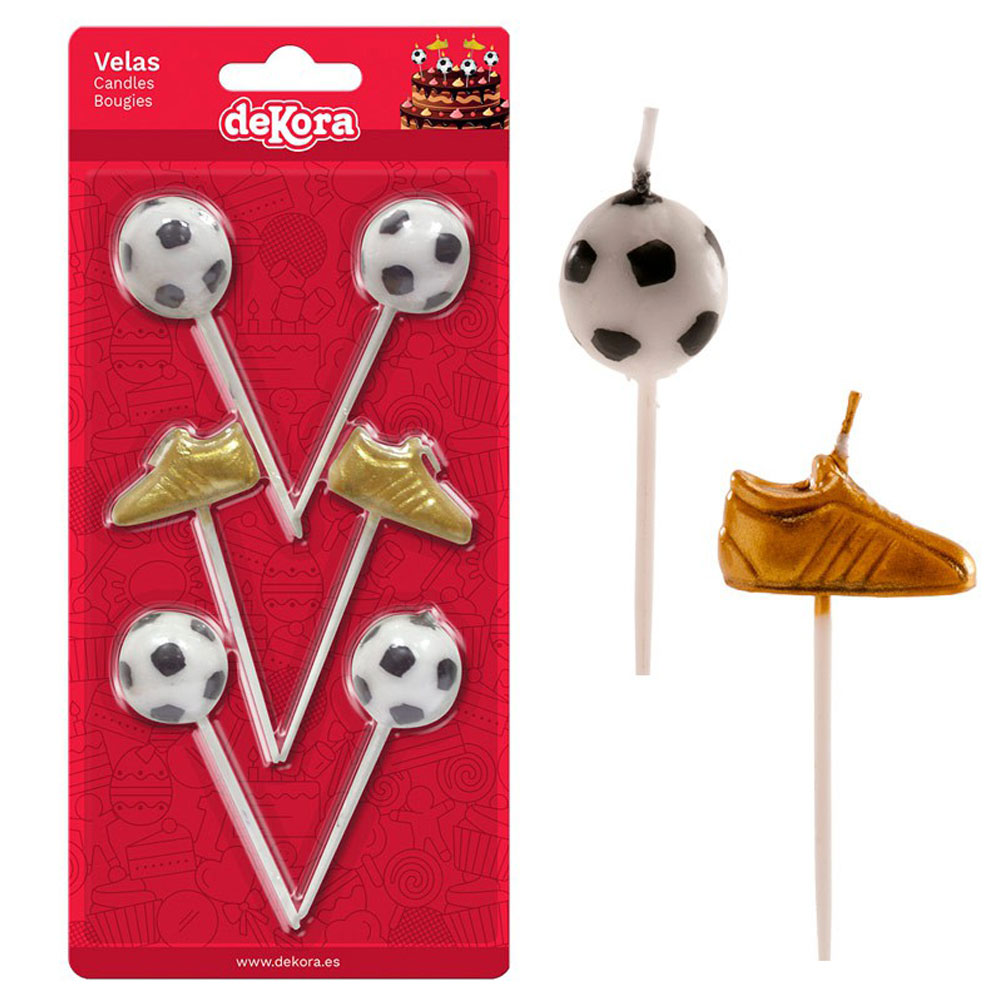 Fotbollar och Fotbollsskor Tårtljus innefattar ett paket med fyra fotbollstårtljus och 2 guldiga tårtljus skor.