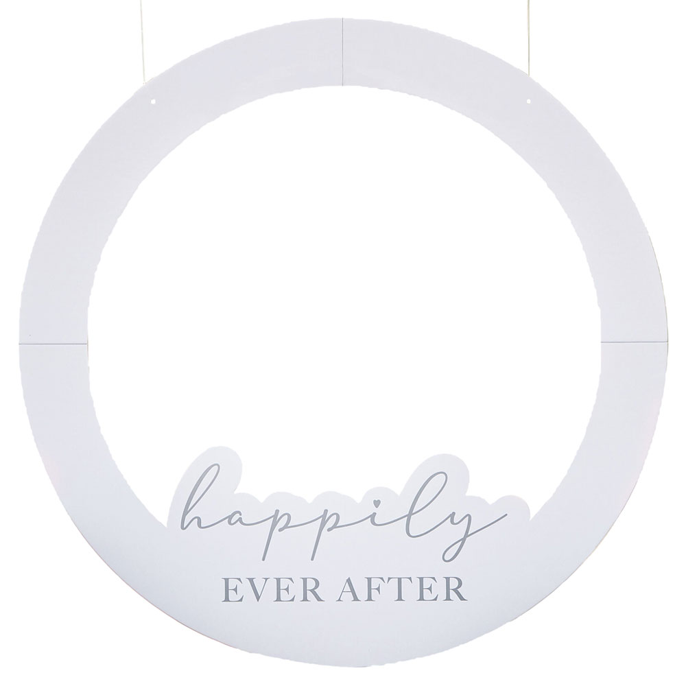Fotoram A Touch of Pampas omfattar en ljusblå fotoram med texten "Happily Ever After". Medföljer även gråa bokstavsklistermärken att klistra fast på ramen. Ramen är tillverkad av papp och är ca 68 cm stor. Ett transparent snöre för upphängning ingår.