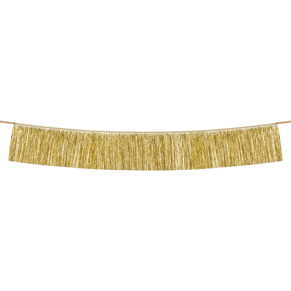 Fullända din festdekoration med en glänsande guldgirlang! En läcker girlang med snygga fransar i guld som snabbt och enkelt livar upp din fest. Mot en vägg eller kanske i taket kommer den att se riktigt snygg ut samtidigt som den sprider en härlig feststämning. Utmärkt girlang till exempelvis nyår, en födelsedag eller annat firande där en dekoration i guld passar.