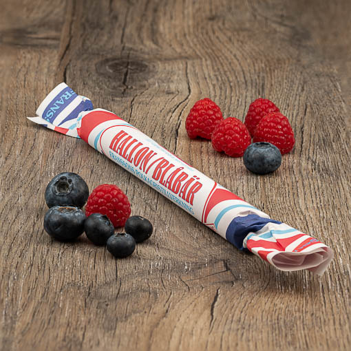 Polkagris från Gränna är välförtjänt känt i hela Sverige. Denna fantastiskt goda äkta polkagris av Franssons med smak av hallon och blåbär är verkligen i en klass för sig. En riktig sommardröm.