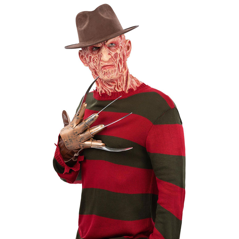 Freddy Krueger Stickad Tröja omfattar en röd och grön randig stickad tröja med sliten krage och kanter.