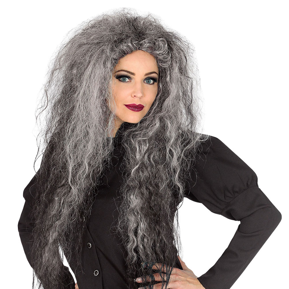 Frissig Häxperuk Grå omfattar en grå, riktigt lång peruk med frissiga lockar. Peruken passar vuxna och är gjord i polyester.