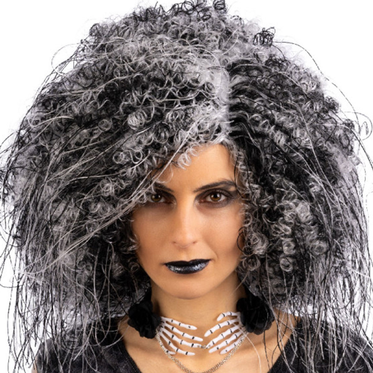 Frissig Häxperuk Svart och Vit omfattar en lång svart och vit peruk som har frissiga lockar blandat med rakt hår.