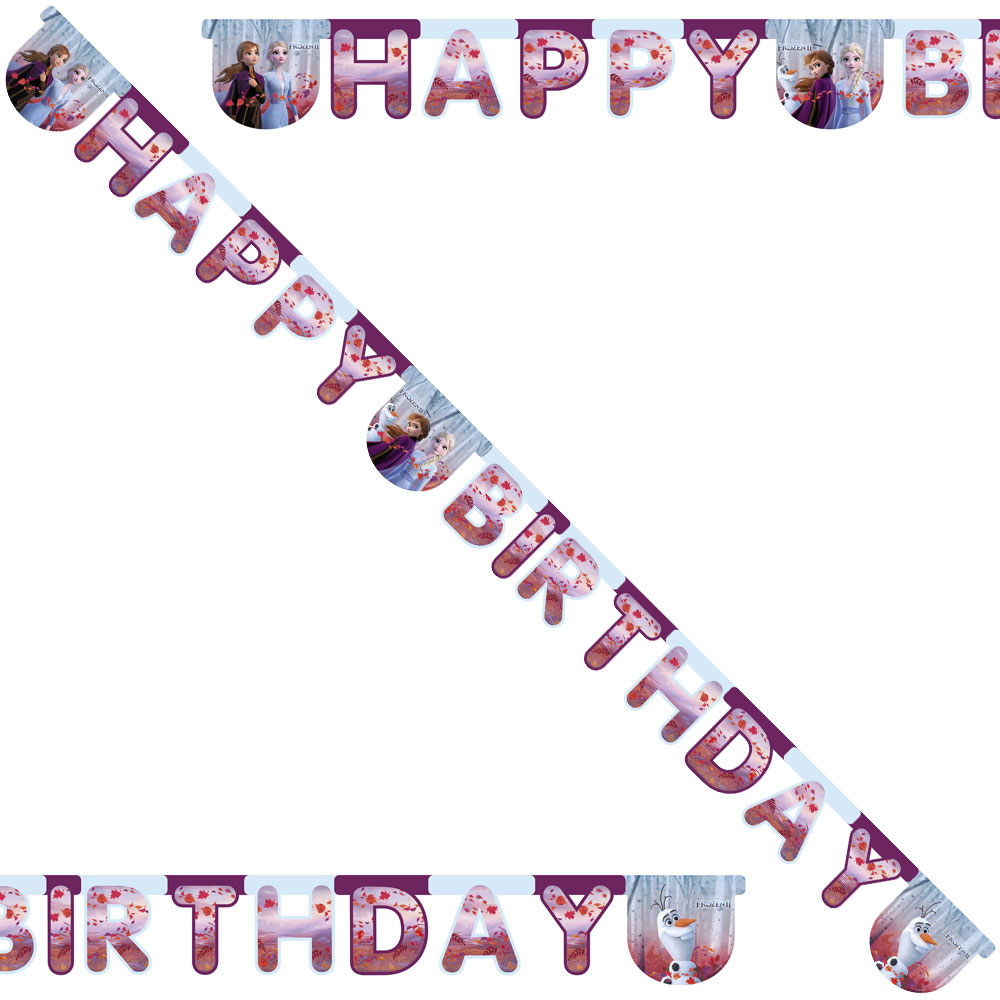 Frost 2 Happy Birthday Banderoll består av en banderoll med texten "Happy Birthday" samt 3 motiv av karaktärerna från filmen Frost. Bokstäverna och bilderna sitter fast på ett litet snöre som även kan användas för att hänga upp dekorationen. Tillverkad i papp.