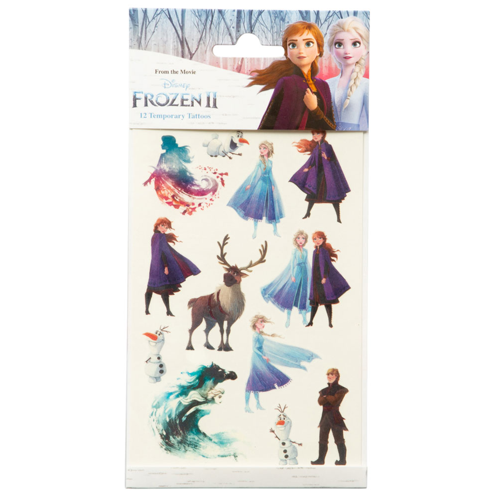 Frozen 2 Temporära Tatueringar omfattar ett ark med gnuggis tatueringar med motiv av karaktärer från Frozen. Instruktioner för att applicera tatueringarna finns på förpackningen.
