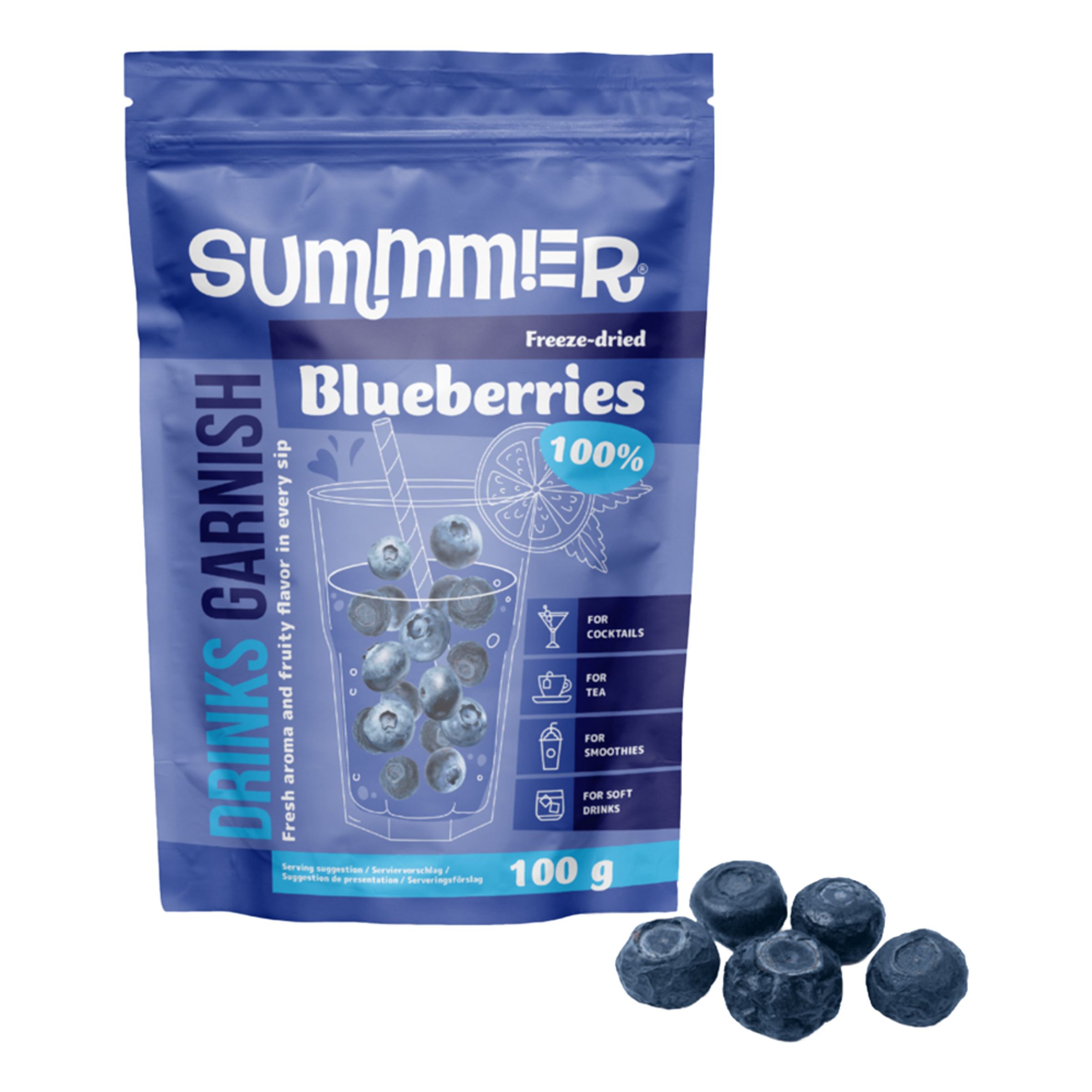 Gör nästa drink till en renodlad naturupplevelse. Till din hjälp får du en hel påse proppad med frystorkade blåbär. Gott och vackert för ögat!