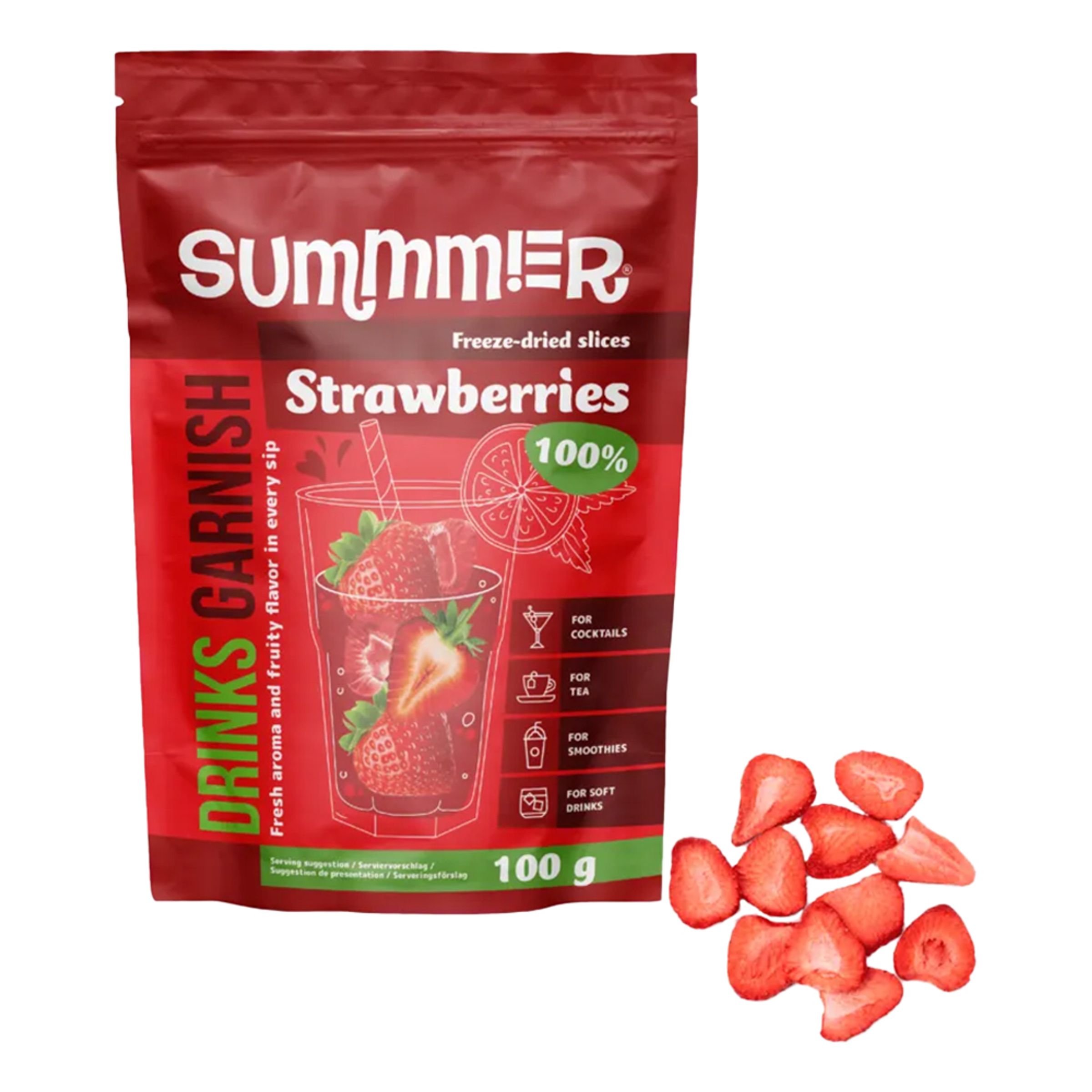 Frystorkade Jordgubbar säljs på påse om 100 gram.