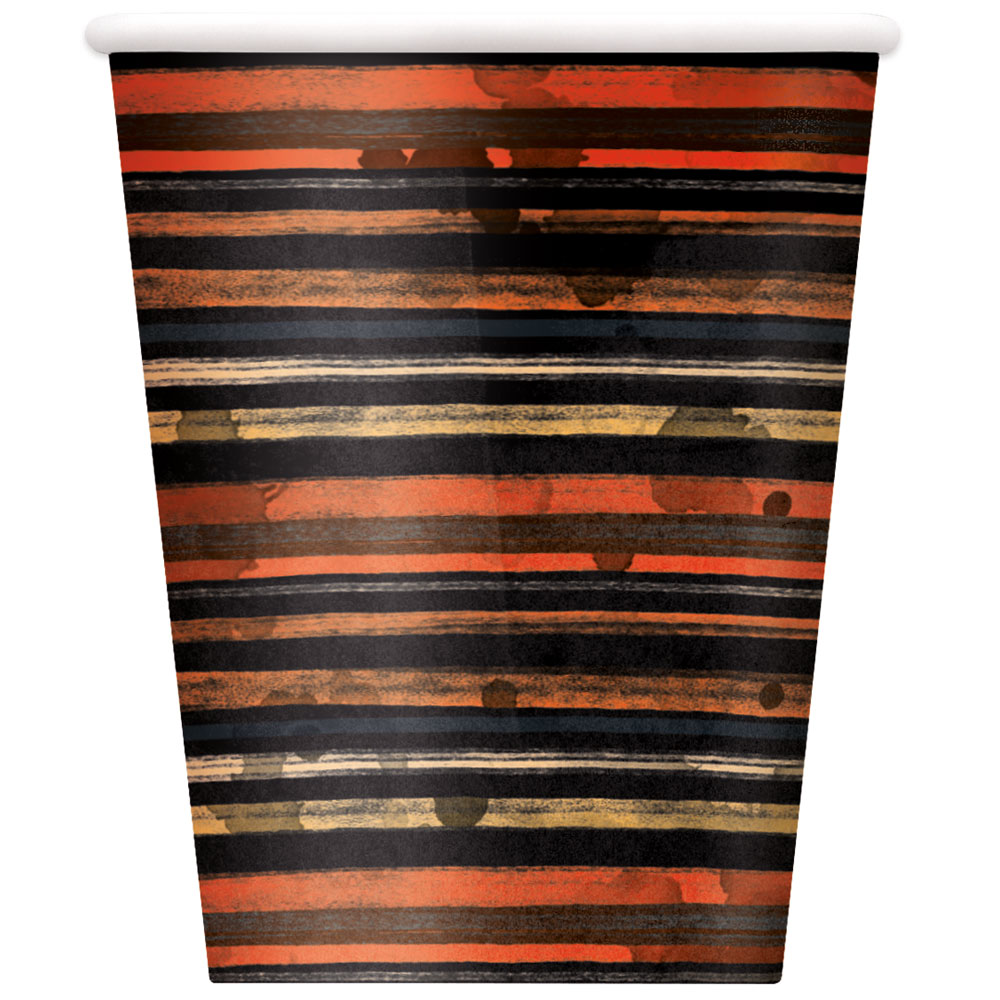 Full Moon Halloween Muggar innehåller 8 stycken engångsmuggar i svart, orange och gult i ett randigt mönster. Tillverkade av papp.