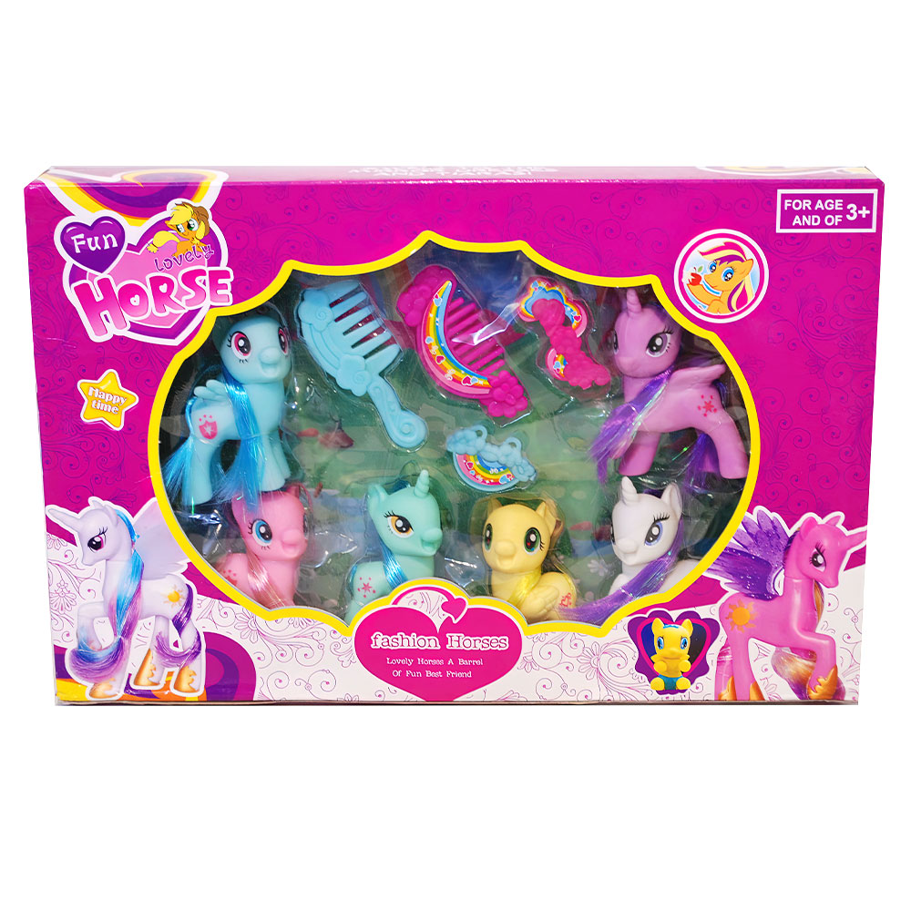 Lek tillsammans med magiska enhörningar, pegasus och ponnys med detta roliga Fun Horse Ponny Set! I detta leksak set hittar du förtrollande ponny häst leksaker med fina frisertillbehör som blir en toppenbra leksak för alla som gillar magiska enhörningar, ponnys och pegasus. Kamma manarna och svansarna och dröm dig bort i en förtrollande lek med dessa leksaksponnyer!