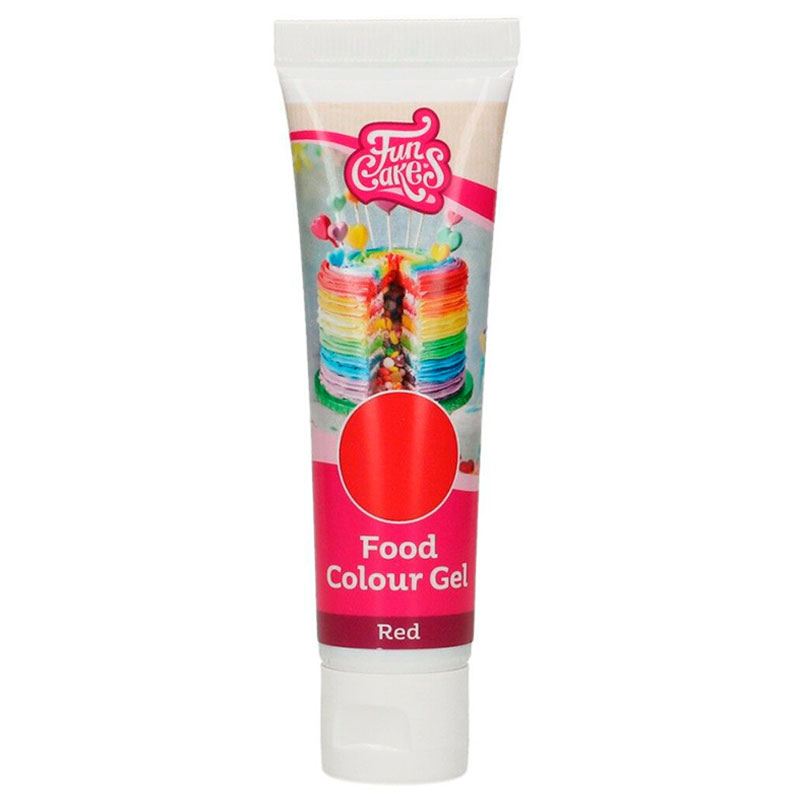 FunCakes Gelefärg Röd omfattar 30 gram koncentrerad karamellfärg i rött. Färgen passar till användning i exempelvis sockerpasta, marsipan, glasyr, kräm, deg m.m.