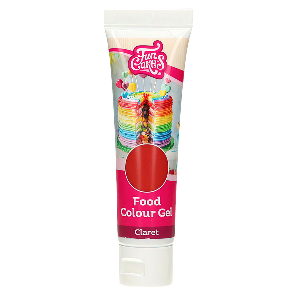 FunCakes Gelefärg Vinröd omfattar 30 gram koncentrerad karamellfärg i vinrött. Färgen passar till användning i exempelvis sockerpasta, marsipan, glasyr, kräm, deg m.m.