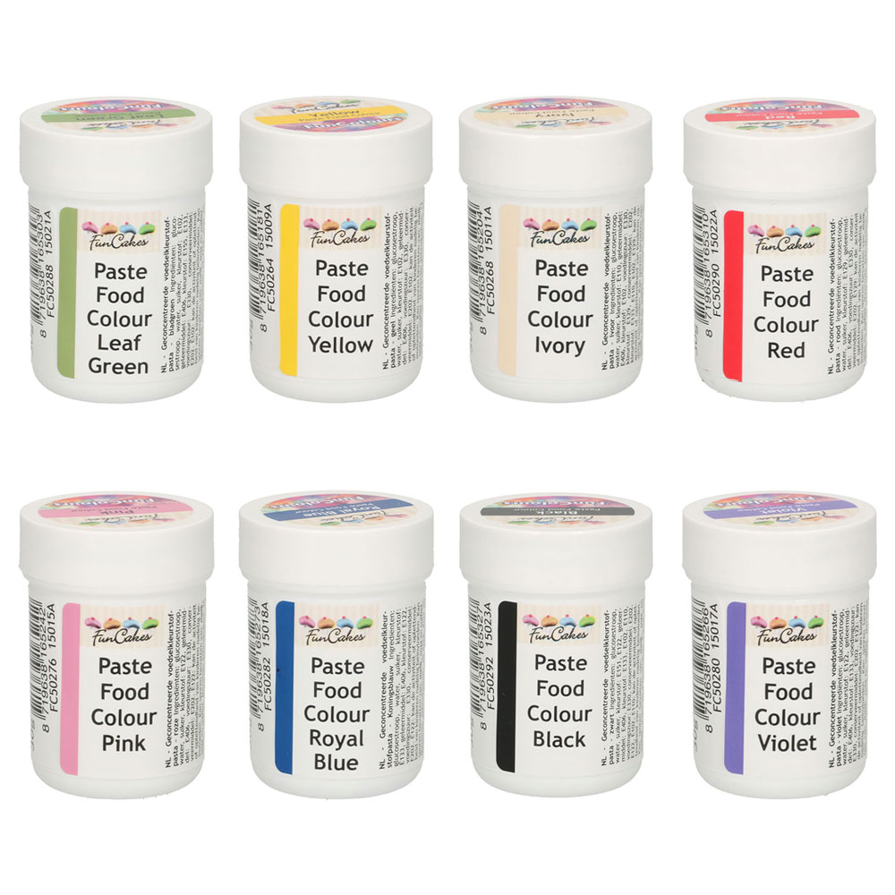 FunColours Pastafärg Set omfattar åtta koncentrerade pastafärger i olika färger som används till sockerpasta, marsipan gum paste, grädde, smörkräm och liknande. Pastafärgerna är bakstabila upp till 200°C. Applicera färgen med en tandpetare, ta alltid en ny tandpetare för varje gång du tar mer färg. Ta lite färg åt gången tills du fått önskad färgstyrka. Knåda eller blanda in färgen ordentligt för en jämn och slät nyans eller knåda den lite mindre för en marmorerad effekt. Färgen tvättas enkelt bort från…
