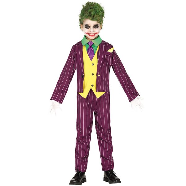 Galen Skurk Maskeraddräkt Barn omfattar en galen skurk barndräkt med en lila kavaj med matchande byxor samt en grön T-shirt med en fastsydd gul väst och en fastsydd lila slips.