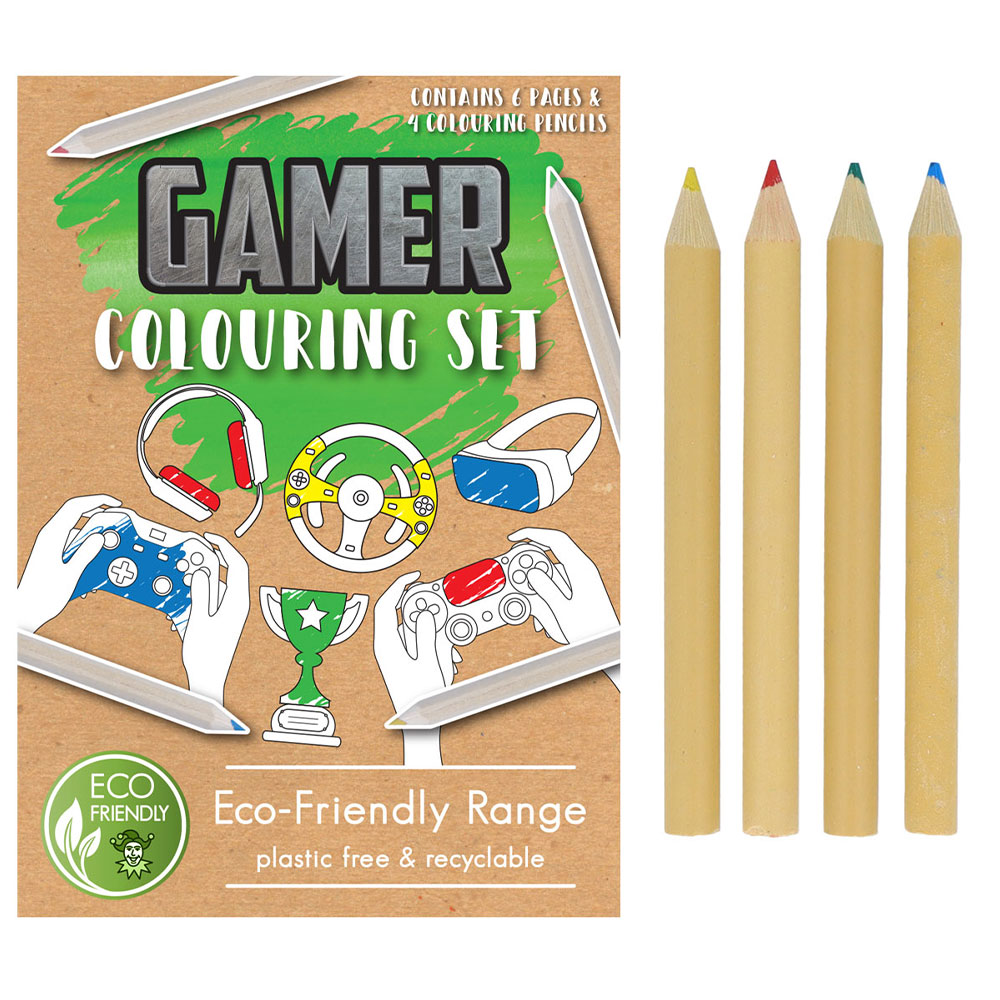 Gamer Målarset Eco omfattar ett kit med sex stycken målarblad med olika tv-spelsmotiv samt fyra stycken mini färgpennor i färgerna blå, grön, röd och gul. Produkten är miljövänlig, plastfri och återvinningsbar.